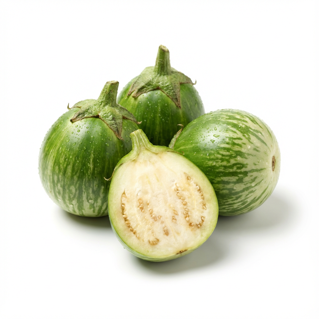 Thai-Auberginen sind kleine, runde, meist grün‑weiß gesprenkelte Auberginen, die in der thailändischen Küche sehr beliebt sind. Sie haben einen knackigen Biss, leicht bitteren Geschmack und eignen sich perfekt für Currys, Wokgerichte und Salate.